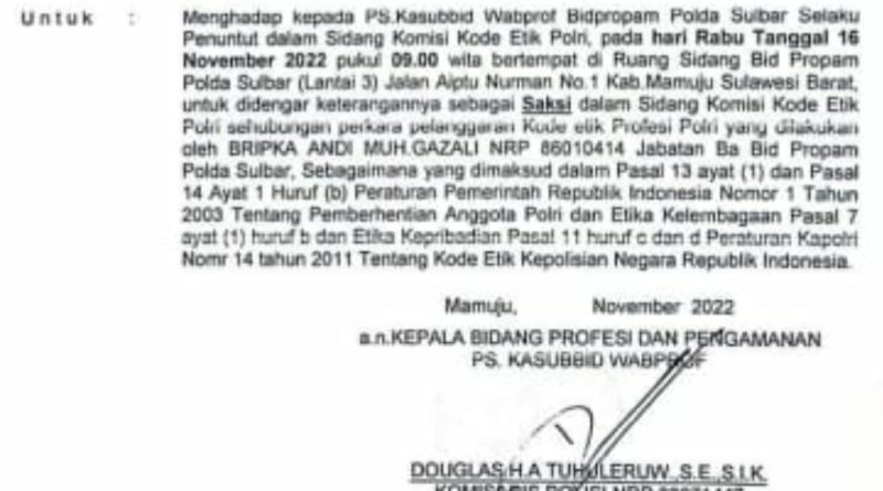 Mamuju,27 November 2022. Pada tanggal 16.11.2022 bertempat di Ruang sidang Bidang Propam Polda Sulawesi Barat terlaksana Sidang Komisi Kode Etik Polri.