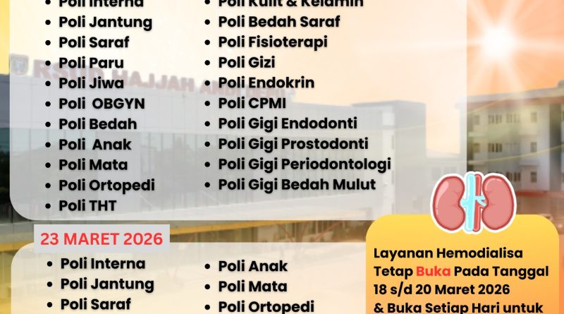 Sehubungan dengan Hari Libur Nasional dan Cuti Bersama Hari Raya Nyepi & Hari Raya Idul Fitri 1447 H Tahun 2026, RSUD Hajjah Andi Depu tetap membuka layanan kesehatan untuk masyarakat di Kabupaten Polewali Mandar.